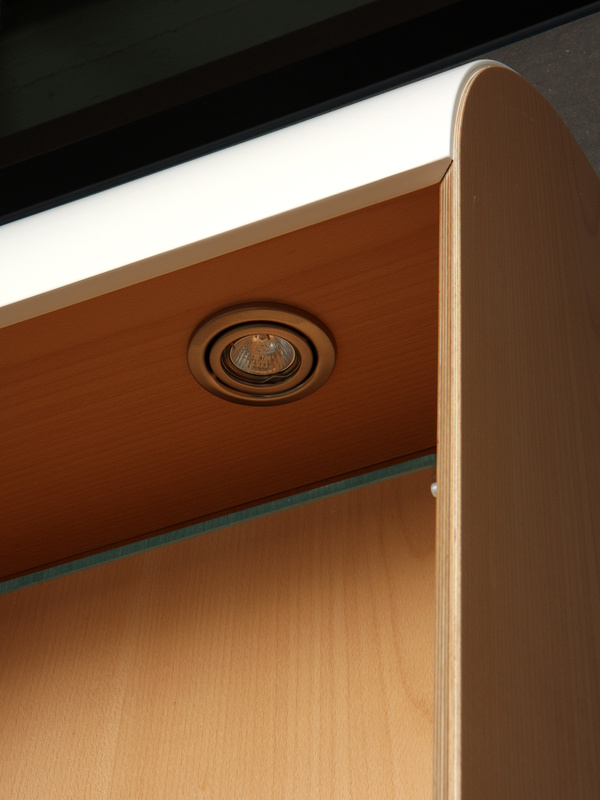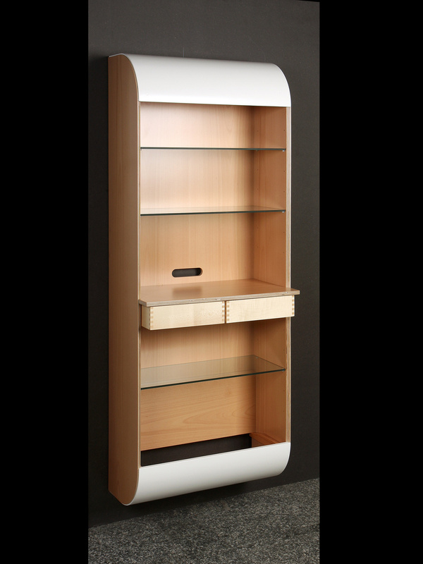 Flurschrank aus Buche Multiplex, lackiert, mit Massiv-Ahorn-Schubkästen und Glasfächern.