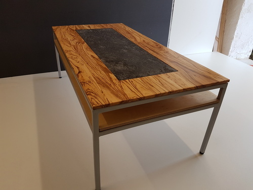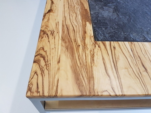 Tisch aus Olive mit innen-liegender Schieferplatte und Stahlrahmen